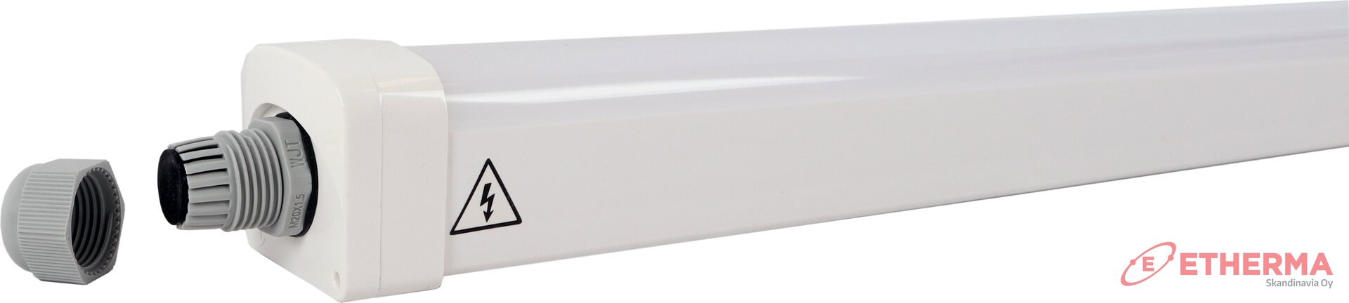 Kiinteällä LED-moduulilla varustettu runkovalaisin soveltuu mm. yleisvalaistukseen varasto- ja logistiikkatiloihin, parkkihalleihin ja