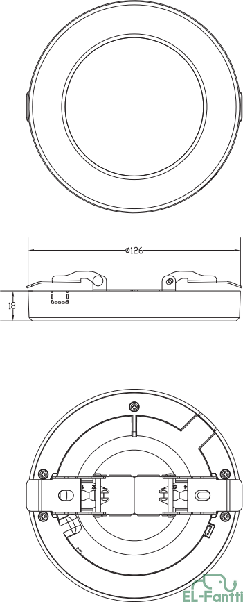 Käyttöjännite: 230 V, 50 Hz Teho: 6 W PF: > 0,5 Valovirta: 400 lm Värilämpötila, CCT: 3 000 K, lämmin vakoinen Ra/CRI: > 80 Elinikä: 30 000 h Valonjakokulma: 120° Materiaali: PC-/PS-muovi, alumiini, teräs Väri: Valkoinen, valopinta opaali Verkkojohto: H03VVH2-F 2x0,75mm2, 0,2 m, vapaat holkitetut johdinpäät Mitat: Ø 126 mm x 17.8 mm, valopinta Ø 82 mm Paino: 175 g Asennus: Pinta-asennus, puoliuppo Ø 55–80 mm aukkoon Käyttölämpötila: +5°C ~ +45°C, vain sisäkäyttöön Kotelointiluokka: IP20/IP43 (IP43 kattoasennuksessa) Energiamerkki LED valaisin, ei vaihdettavissa oleva valonlähde