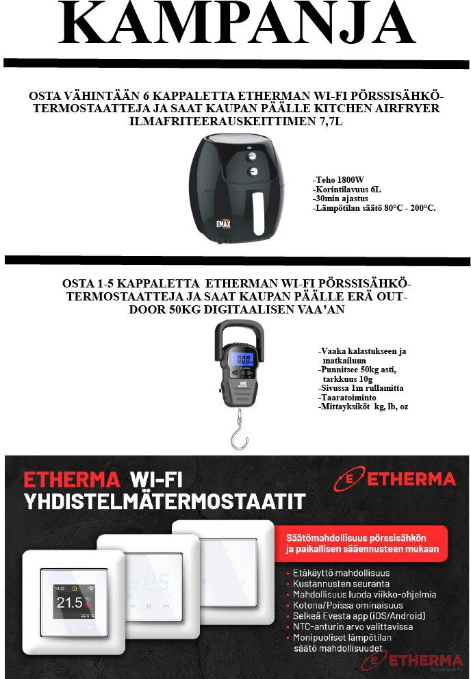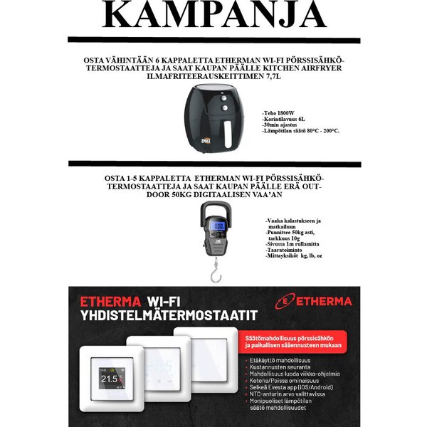 Tuotteen kuvausOstamalla 6kpl tai enemmän Etherman Wi-Fi termostaatteja saat kaupanpäälliseksi Kitchen AirFryer ilmafriteerauskeittimen.