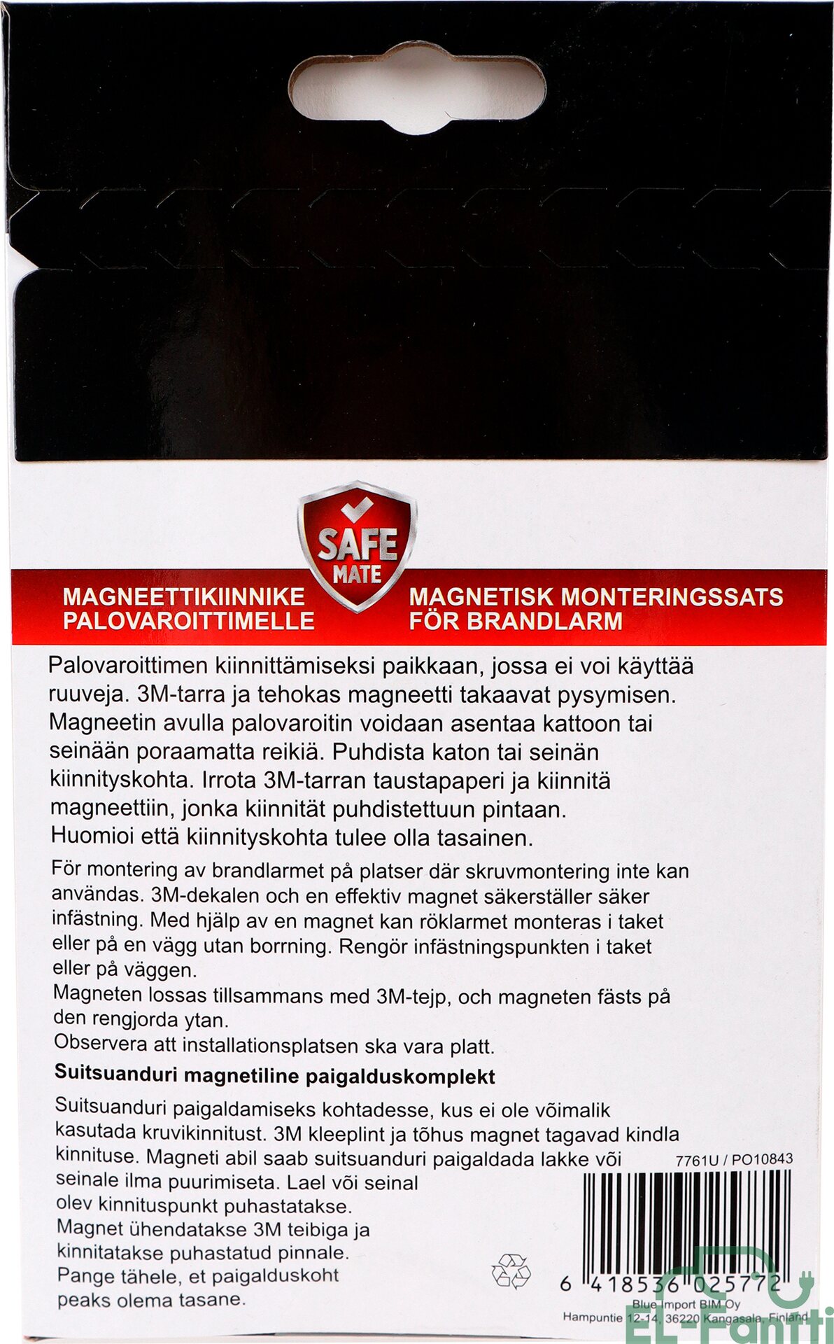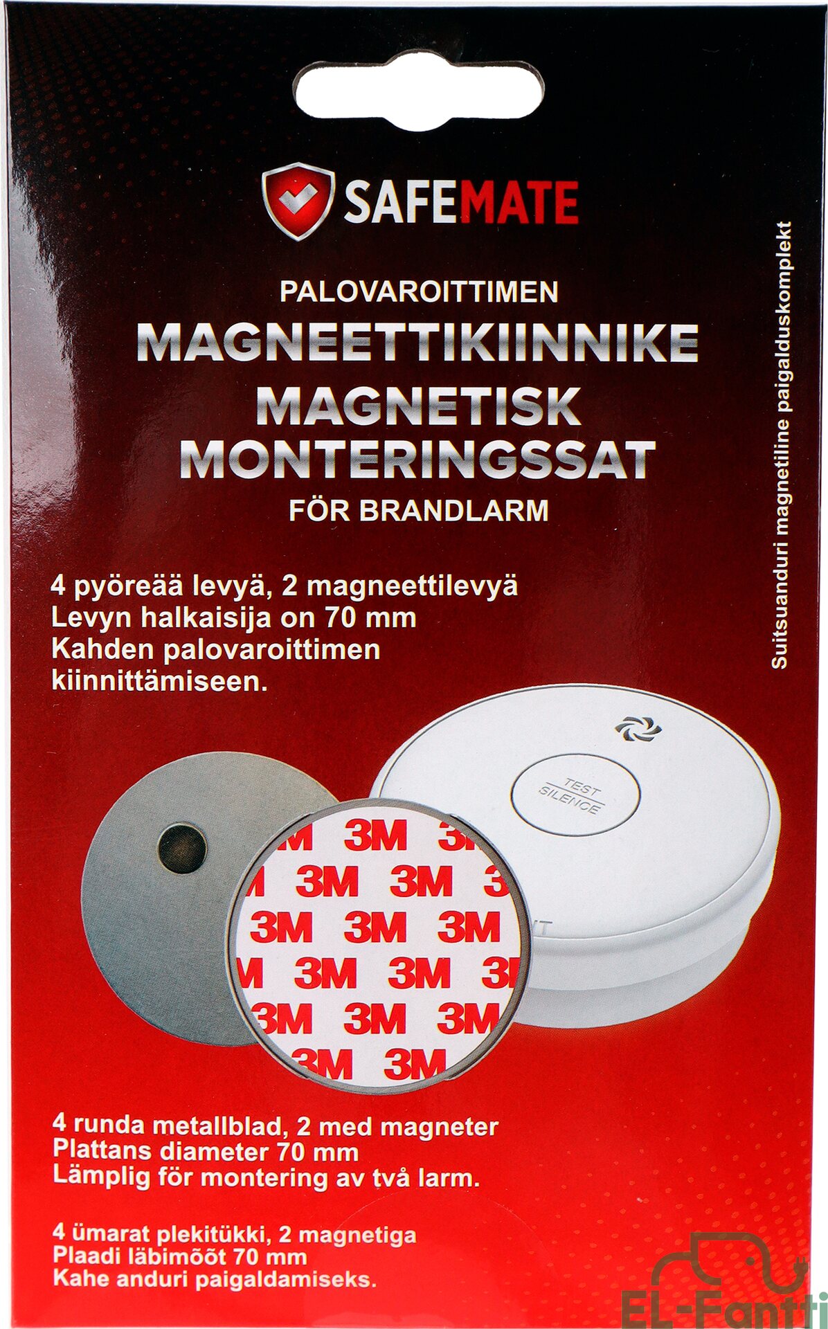 Magneettikiinnikesarjalla pystyy vaivattomasti kiinnittämään kaksi palovaroitinta paikkoihin, joissa ei ole mahdollisuutta käyttää ruuvikiinnitystä. 3M-tarra ja tehokas magneetti varmistavat tukevan kiinnityksen. Kiinnityspinnan on oltava tasainen ja puhdas. Sisältää 4 pyöreää peltilevyä, joista kahdessa magneetti.